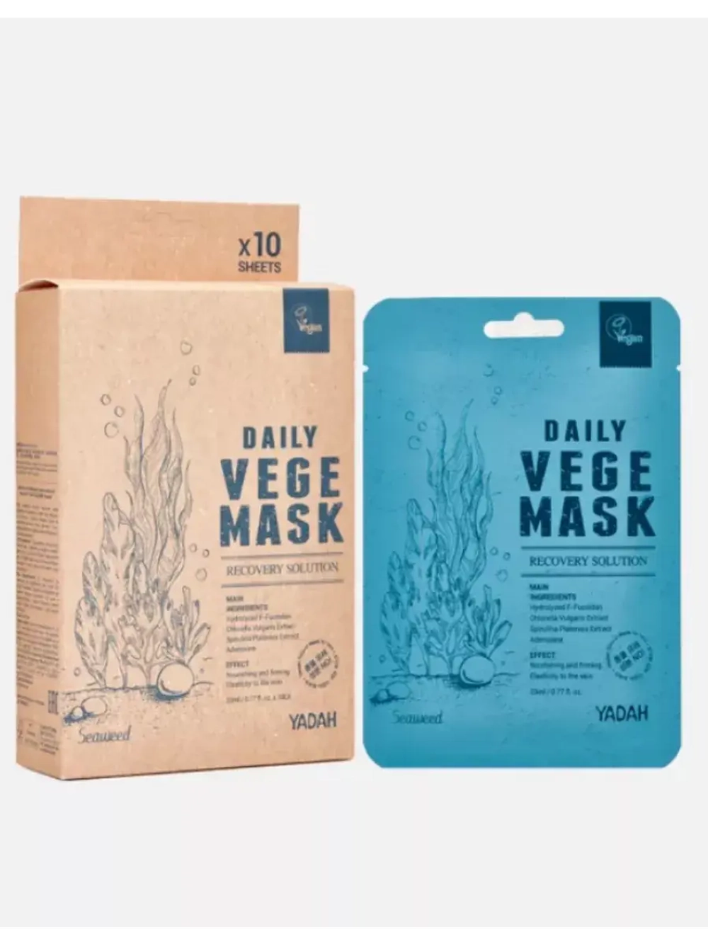 Тканевая маска YADAH, содержащая экстракты нескольких видов водорослей, восстанавливает кожу, повышает её эластичность и действует против морщин. Продукт с полученным из водорослей фукоиданом также питает кожу и делает её более упругой. Формула включает натуральные экстракты хлореллы, вакаме, спирулины и бурой водоросли келп.
