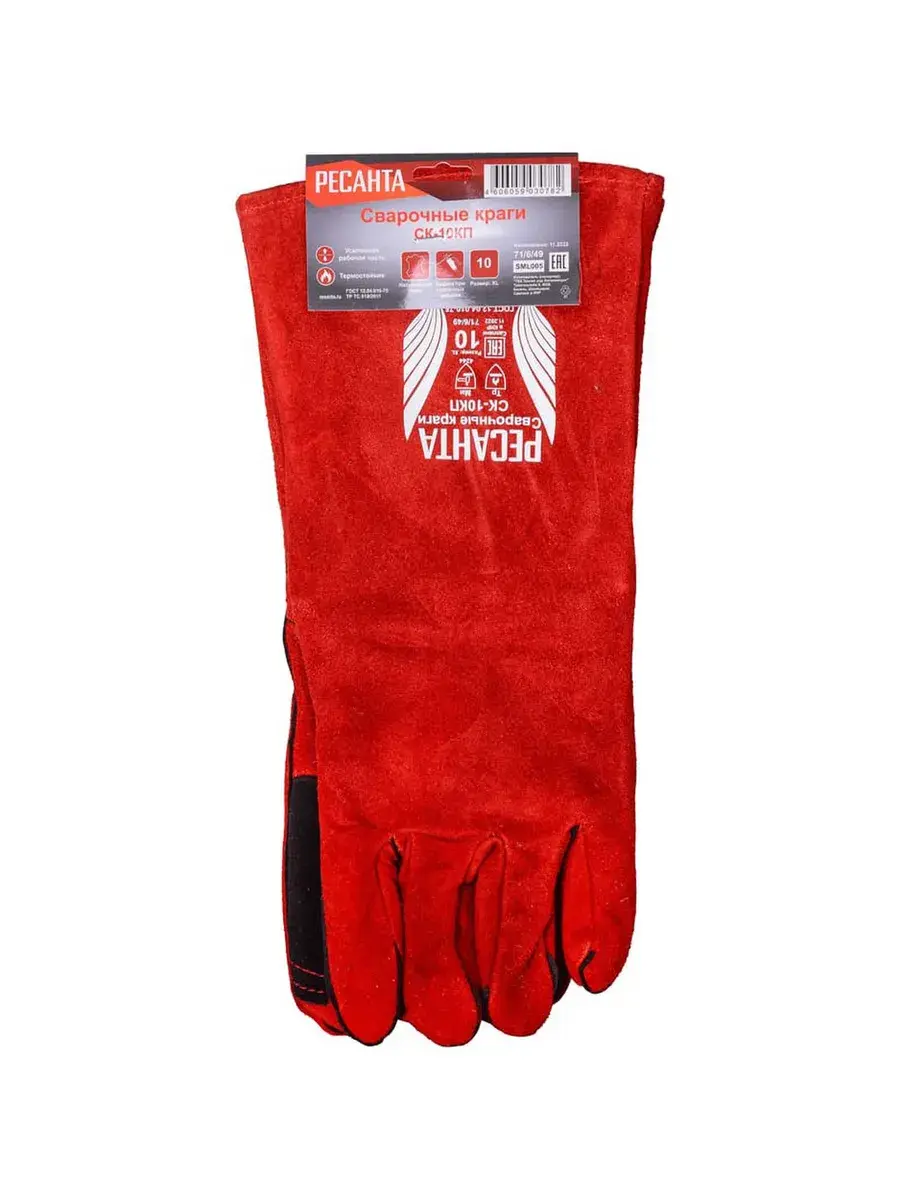 Краги предназначены для защиты рук при проведении сварочных работ. Ми - защита от механического воздействия Тр - защита от повышенных температур Улучшенный спилок класса «А» Тканевая подкладка создает дополнительное удобствопри работе. Усиленная рабочая часть для повышения прочности Удлиненный манжет защищает от попадания брызг. Размер: 10XL Степень износостойкости: 4. Стирание 2. Порез 4. Разрыв 4. Прокол Технические характеристики сварочных краг Ресанта СК-10КП 71/6/49 Тип пятипалые Назначение для сварки Материал натуральная кожа Утепленные нет Размер универсальный Размер (цифровая система маркировки) универсальный Размер (буквенная система маркировки) универсальный Вес нетто 0.42 кг Способ фиксации свободный край Цвет красный/черный ГОСТ/ТУ ГОСТ 12.04.010-75 Количество пар в упаковке 1 Гарантия производителя 1 год на товары Ресанта